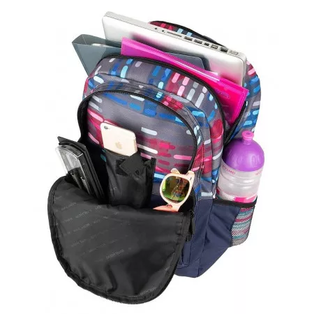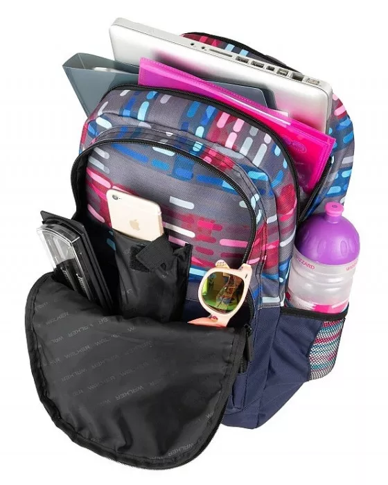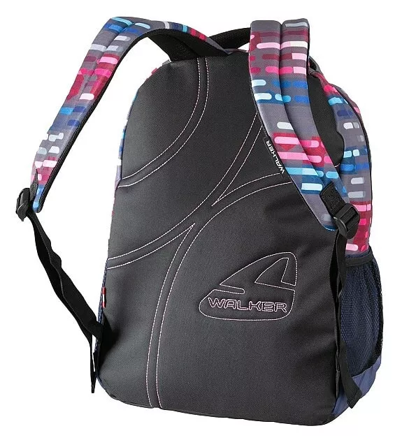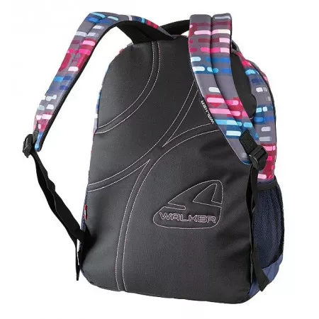 Volnočasový batoh Walker CLASSIC Lines Blue Pink. Volnočasový batoh má tři hlavní kapsy. Na přední kapse batohu je dole našita menší kapsa. Uvnitř je řešena jednoduše, bez dalších kapsiček, uzavíraná zipem.