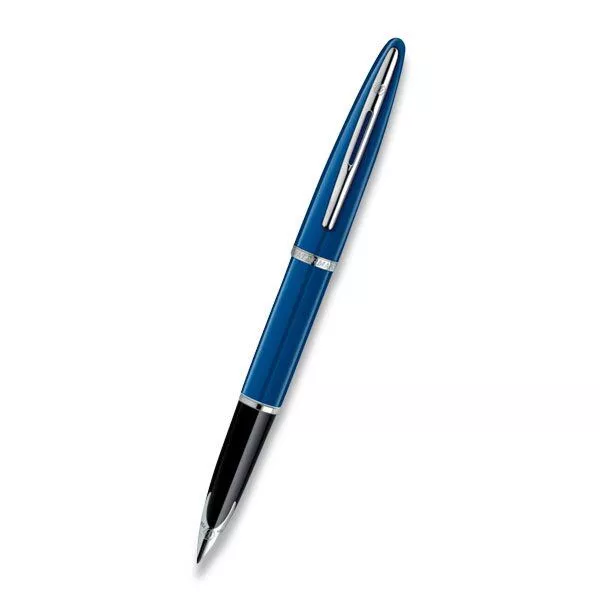 Waterman Carène Made in France DLX Blue CT plnicí pero hrot M. Modře lakované mosazné tělo a víčko s vlnkovou reliéfní rytinou vyvedenou leptáním a pokovené palladiem. V kombinaci s doplňky pokovenými palladiem. Hrot z 18karátového zlata (ryzost Au 750/1000) se zdobnou rytinou pokovený rhodiem.