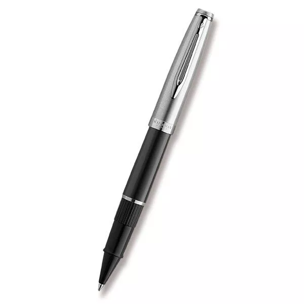 Waterman Emblème Black CT roller. Roller s nasazovacím víčkem se standardní náplňí do rollerů. Dodáváno s černou náplní. Lze používat náplně do rollerů i do kuličkových per. Dodáváno v dárkové krabičce. Tělo z pryskyřice a víčko z broušené nerezové oceli. V kombinaci s pochromovanými doplňky.