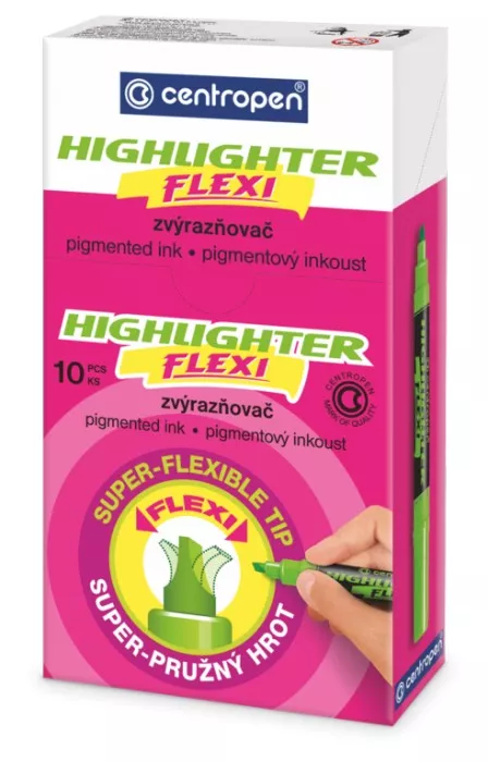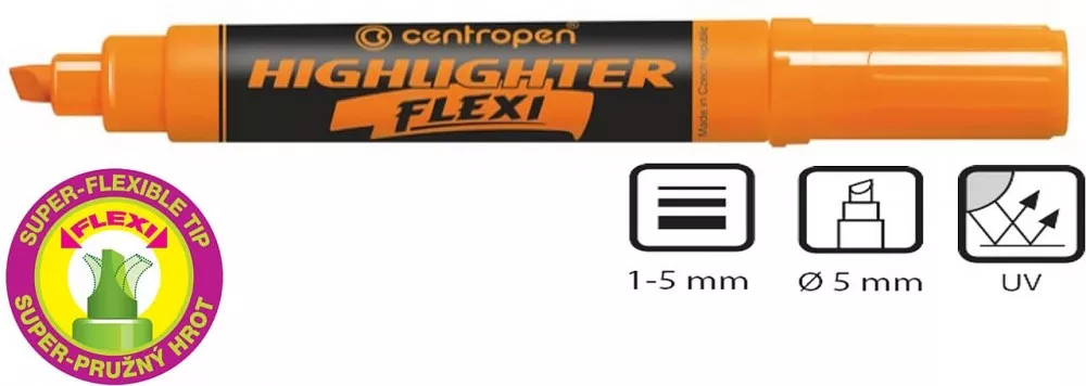 Zvýrazňovač Centropen 8542 oranžový. HIGHLIGHTER FLEXI 8542. Velkokapacitní zvýrazňovač se super pružným hrotem pro hladké a pohodlné zvýraznění textu na všech druzích papírů.. Fluorescenční pigmentový inkoust. Odolnost proti UV záření. Klínový hrot. Šířka stopy 1 – 5 mm.