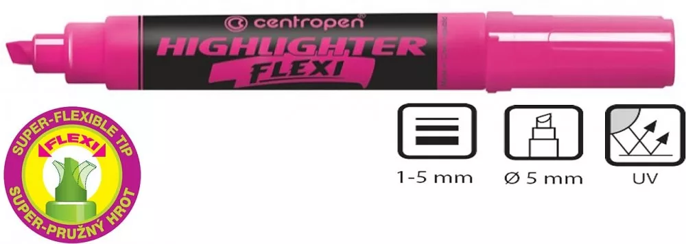 Zvýrazňovač Centropen 8542 růžový. HIGHLIGHTER FLEXI 8542. Velkokapacitní zvýrazňovač se super pružným hrotem pro hladké a pohodlné zvýraznění textu na všech druzích papírů.. Fluorescenční pigmentový inkoust. Odolnost proti UV záření. Klínový hrot. Šířka stopy 1 – 5 mm.