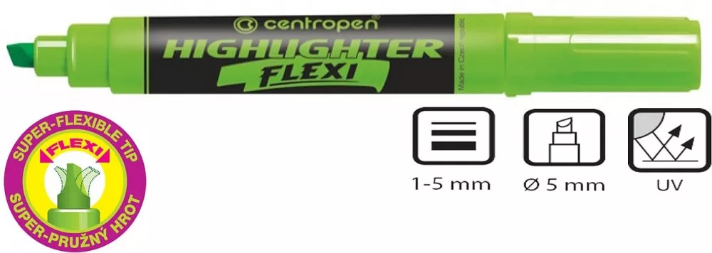 Zvýrazňovač Centropen 8542 zelený. HIGHLIGHTER FLEXI 8542. Velkokapacitní zvýrazňovač se super pružným hrotem pro hladké a pohodlné zvýraznění textu na všech druzích papírů.. Fluorescenční pigmentový inkoust. Odolnost proti UV záření. Klínový hrot. Šířka stopy 1 – 5 mm.
