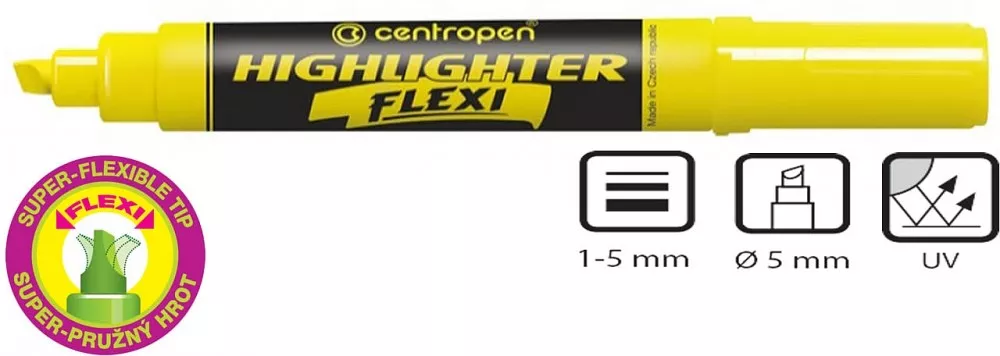Zvýrazňovač Centropen 8542 žlutý. HIGHLIGHTER FLEXI 8542. Velkokapacitní zvýrazňovač se super pružným hrotem pro hladké a pohodlné zvýraznění textu na všech druzích papírů.. Fluorescenční pigmentový inkoust. Odolnost proti UV záření. Klínový hrot. Šířka stopy 1 – 5 mm.